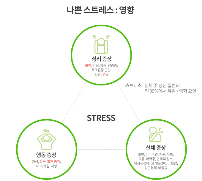 스트레스란? 살아가면서 받는 자극에 대한 우리 몸과 마음의 반응을 말하죠. 압력을 받고 긴장하게 되면 스트레스호르몬이 분비되어 싸울 수 있는 힘과 에너지를 준비합니다. 하지만 너무 지나치게 많이 분비되거나 오래 지속이 되면 우리 몸은 탈이 나서 수많은 병들이 생기게 됩니다.